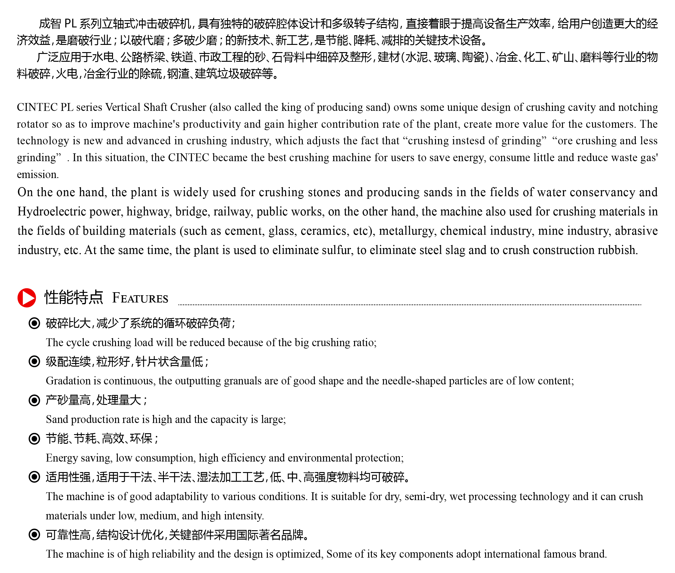 成智PL系列立軸式?jīng)_擊破碎機,具有獨特的破碎腔體設(shè)計和多級轉(zhuǎn)子結(jié)構(gòu),直接著眼于提高設(shè)備生產(chǎn)效率,給用戶創(chuàng)造更大的經(jīng)濟效益,是磨破行業(yè);以破代磨;多破少磨;的新技術(shù)、新工藝,是節(jié)能、降耗、減排的關(guān)鍵技術(shù)設(shè)備。 廣泛應(yīng)用于水電、公路橋梁、鐵道、市政工程的砂、石骨料中細(xì)碎及整形,建材(水泥、玻璃、陶瓷)、冶金、化工、礦山、磨料等行業(yè)的物料破碎,火電,冶金行業(yè)的除硫,鋼渣、建筑垃圾破碎等。